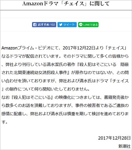 『新潮社』は盗作疑惑が浮上している『チェイス』について、「弊社および清水氏はドラマ『チェイス』の制作について何ら関知いたしておりません。なお『殺人犯はそこにいる』の映像化につきましては、書籍発売後から数多くのお話を頂戴しておりますが、事件の被害者であるご遺族の感情に配慮し、弊社および清水氏は慎重を期して検討を進めております。」