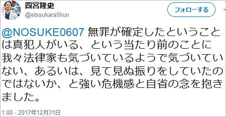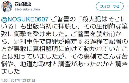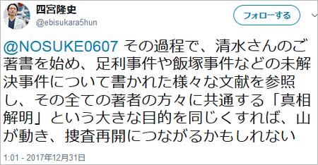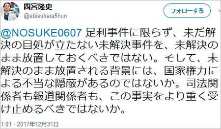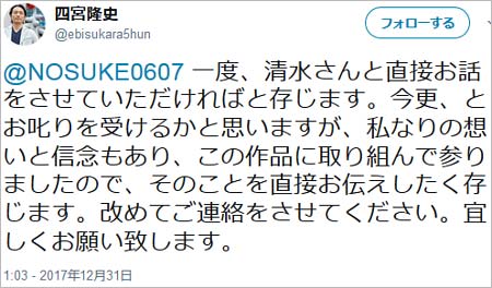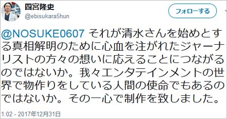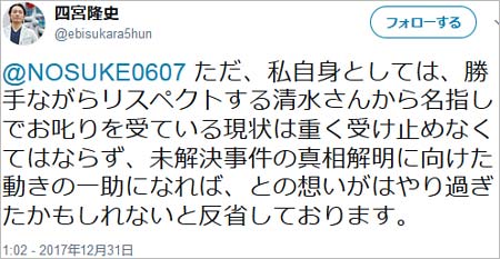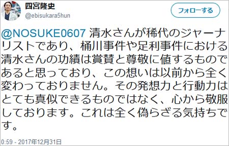 <↓の画像が、四宮隆史さんが清水潔さんに送っているツイート>