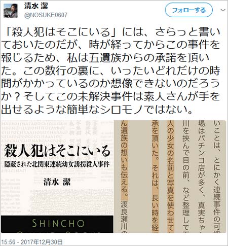 - 『殺人犯はそこにいる』には、さらっと書いておいたのだが、時が経ってからこの事件を報じるため、私は御遺族からの承諾を頂いた。この数行の裏に、いったいどれだけの時間がかかっているのか想像できないのだろうか?そしてこの未解決事件は素人さんが手を出せるような簡単なシロモノではない。
