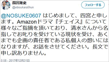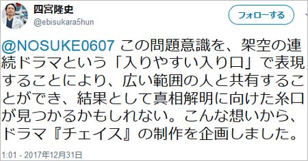 その一方、『チェイス』の共同プロデューサーで、クリエイター(脚本家・福田靖さんなど)や俳優のマネジメント、映画等の企画プロデュースを手掛けている四宮隆史さんはツイッター上で、清水潔さんのアカウントに向けてドラマ化に至った経緯の説明をしています。