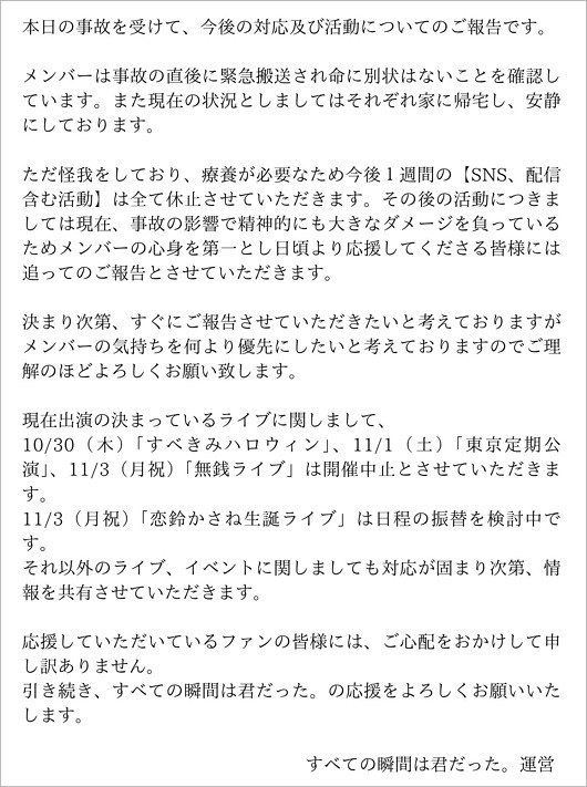 今後の活動については、事故の影響で精神的に大きなダメージを負っているため、メンバーの体調を最優先に考えて、30日から11月3日にかけて予定していたライブは全て中止とし、また今後1週間はSNSを含む配信活動も全て休止すると発表しています。