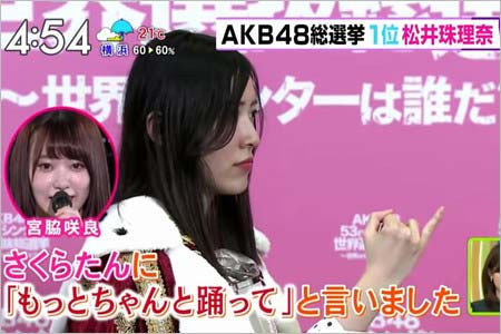 松井珠理奈さんはイベント終了後の囲み取材時に、「正直言います。全部話しますね。じゃあ今まで隠してきたこと。(開票イベント前の)コンサートで『10年桜』を歌いました。私は『再開の誓い~』の瞬間に、さくらたんに『もっとちゃんと踊って』と言いました。『じゃないとAKBが終わるから』。それを言ったら、さくらたんは出れなくなっちゃいました…」